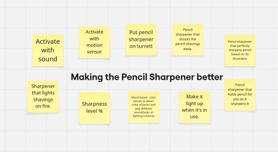 This time around however, before I got started I decided to do a quick brainstorm on different ways I could iterate the pencil sharpener using Arduino. This way I'd have a number of challenges to cross off before having to think of something new. These were a few I came up with.